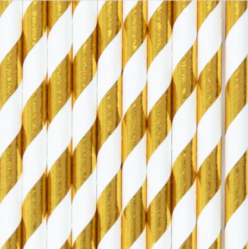 Słomki papierowe, złote, proste, opakowanie 10 sztuk. Długość 19,5 cm, średnica ok. 7 mm.