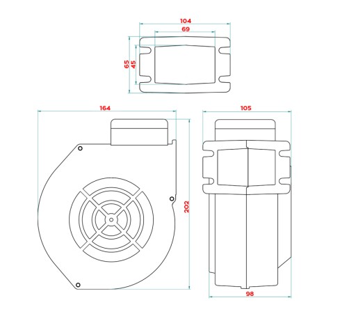 Dmuchawa składa się z dwóch elementów obudowy aluminiowej. W obudowie zamontowany jest silnik z zewnętrznym wirnikiem wykonanym ze stali cynkowanej. Otwór wlotowy wentylatora przesłonięty jest siatką metalową zabezpieczając tym samym wirnik przed dostaniem się do niego elementów mogących go uszkodzić. Otwór wylotowy zakończony jest kołnierzem z otworami służącymi do zamontowania dmuchawy. Wszystkie połączenia elektryczne umieszczono w puszce przyłączeniowej wykonanej z materiału izolacyjnego. Silnik dmuchawy przystosowany jest do płynnej regulacji prędkości obrotów ustawianych poprzez parametry sterownika. Zastosowano silnik niemieckiej firmy Ziehl-Abegg, który charakteryzuje wysoka jakość wykonania oraz trwałość elementów mechanicznych i elektrycznych. Silnik nie jest tanim chińskim zamiennikiem. Wentylator posiada deklarację zgodności CE - rok naniesienia 2014. Oświadczamy, że każda dmuchawa posiada Deklarację zgodności określającą zgodność z dyrektywami: niskonapięciową, kompatybilności elektromagnetycznej oraz polskimi normami.