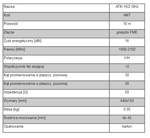 Antena kierunkowa ATK-16/2GHz przeznaczona jest to stosowania w systemach telefonii UMTS pracujących w paśmie 1,9-2,1 GHz. Znakomicie rozwiązuje typowy problem, iż sygnał w miejscu gdzie jest laptop z kartą UMTS lub telefon jest za słaby do poprawnej pracy. W takiej sytuacji zazwyczaj wystarczy dołączenie do telefonu lub modemu anteny pozwalającej na uzyskanie wystarczającego sygnału.