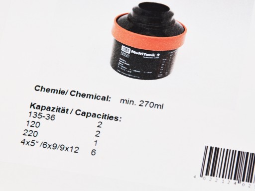 Opis towaru: Koreks firmy Jobo na na 2 szpule małoobrazkowe (lub jedną średnioformatową - szpule są uniwersalne) ewentualnie na szpulę 2509n do wywoływania błon ciętych. W koreksie NIE ma szpul - należałoby je dokupić. Jeśli ma się odpowiednie umiejętności można w 1 szpulę na film 120 wsunąć 2 filmy jeden za drugim. Co nie jest łatwe - nieumiejętne wsunięcie filmu może spowodować ich sklejenie w czasie procesu. Do szpul należałoby dokupić czerwone "hamulce"- zatyczki uniemożliwiające przesuwanie się filmów w czasie obróbki. Szpule NIE są "samozaładowalne" - nie mają kuleczki jak Patersona czy Kaisera należy się trochę natrudzić aby wkręcić filmy - potem idzie już łatwiej. Koreks umożliwia po zakupie przystosowanej do tego szpulki 2509n wywołanie błon ciętych w ilości do 6 sztuk w formacie 6,5x9 cm., 9x12 cm. albo 4x5" Daje się także w szpulce wywołać błony w formacie 10x15 cm. Czarny koreks ma załączony trzpień na szpule, czarną nakrywkę, którą się nie zakręca a nakłada na koreks na "zacisk", oraz czerwony wodoszczelny korek. Koreks NIE posiada pokrętła do kręcenia trzpieniem za szpulami. Można w nim wywoływać błony tylko poprzez odwracanie koreksem, na rolkach w pozycji poziomej lub także poziomo w maszynach wywołujących Jobo - procesorach CPP, CPE2 i podobnych. Przy użyciu procesorów na magnes należy dokupić magnes i wcisnąć go w dno koreksu - oczywiście ze strony zewnętrznej. Jeśli chcemy użyć liftu musimy zamienić zwykłą pokrywkę na pokrywkę z zębatką, która jest nieodzowna w takim przypadku. Koreks nie przecieka - jak każdy - ale do czasu. Należy uważać aby styki pokrywy przykrywającej koreks oraz samego koreksu były suche podczas nakładania. W przeciwnym wypadku koreks może zacząć przeciekać w czasie obróbki. Także czas powoduje rozciąganie i zniekształcanie materiału co może spowodować minimalny wyciek chemii. Wołając w pozycji poziomej zużywamy minimalne ilości chemii: na obróbkę dwóch filmów małoobrazkowych lub średnich potrzeba 270 ml. płynu. W pozycji pionowej należy wlać na 2 filmy 35 mm. 1275 ml. chemii. Koreks zużywa najmniej płynu w przeliczeniu na jeden film w stosunku do koreksów AP, Kaiser czy Paterson. Do skrócenia czasu ostatecznego płukania - także dla wygody - można użyć kaskady do płukania Jobo 3550. Polecam także na wszelki wypadek filtr do wody. Oferujemy także koreksy na inne ilości szpul i dodatkowe szpule różnych producentów.