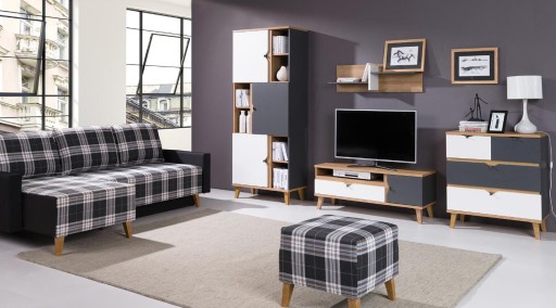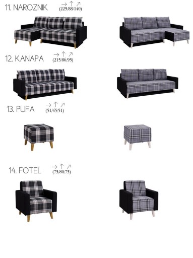 Meble tapicerowane w dwóch wariantach kolorystycznych, ciemna i jasna kratka.