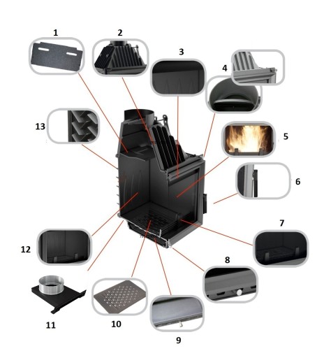- Ścianki paleniska o minimalnej grubości 8mm - gwarantują bezawaryjne działanie paleniska. Gęsto rozmieszczone radiatory - dzięki nim kominek przekazuje więcej ciepła do otoczenia. Materiał żeliwo szare - wytrzymałe, długo utrzymujące temperaturę