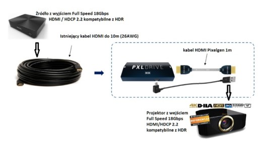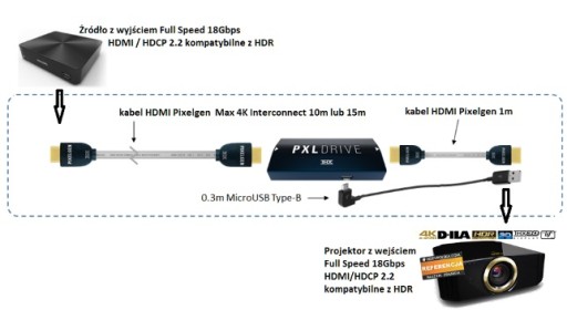Nawiązanie połączenia 4K 18Gbps jest możliwe tylko w przypadku użycia odpowiedniego kabla o długości do 15metrów podłączonego do wejścia wzmacniacza PXLDRIVE oraz krótkiego kabla o długości do 1m łączącego wyjście wzmacniacza z wyświetlaczem. Zasilanie wzmacniacza PXLDRV jest zapewniane przez gniazdo USB wyświetlacza lub z sieci elektrycznej.