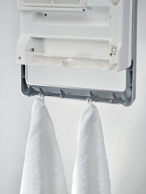 Termowentylator TOUCH posiada zintegrowany z obudową urządzenia reling oraz 4 wieszaki na których możesz powiesić i wysuszyć ręczniki.