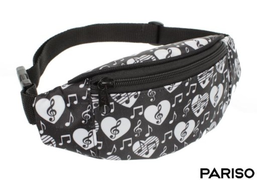 Saszetka nerka dla dziecka. Model full-print serduszka nutki. Polski produkt, producent Pariso. Uszyta z bardzo mocnego materiału Codura.