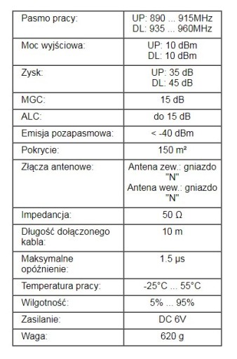 - Repeater GSM wzmacnia pasmo GSM. Pasmo, które wzmacnia urządzenie to 890-915, 935-960 MHz.