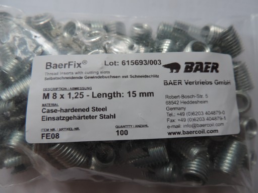 Wkładki samogwintujące firmy BaerFix posiadają stożkowe prowadzenie z nacięciem na metrycznym gwincie zewnętrznym. Przeznaczone są do nacinania własnych gwintów podczas wkręcania ich w rozwiercony otwór naprawianego gwintu. Po wkręceniu tulejki otrzymujemy trwałe połączenie gwintowe odporne na wstrząsy i drgania. Przy wkręcaniu w materiał naprawianego gwintu, tulejki lekko sprężynują do wewnątrz co po wkręceniu śruby powoduje powstanie trwałego połączenia gwintowego.
