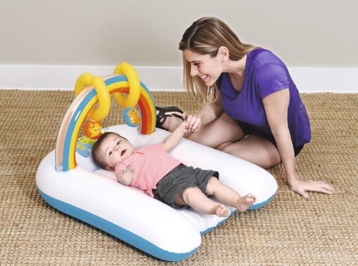 Dmuchany przewijak doskonale sprawdzi się w podróży, na plaży, czy po prostu w mieszkaniu z małym metrażem. Ułatwi przewinięcie Twojego maluszka, zapewniając mu jednocześnie komfort oraz rozrywkę. Na kolorowym, przyciągającym wzrok dziecka pałąku zawiesić można dwie kolorowe piszczałki, które pomogą zająć pociechę, ułatwiając tym samym zmianę pieluszki. Dla wygody maleństwa dno również jest nadmuchiwane. Przewijak wykonany jest z trwałego, testowanego winylu oraz zawiera zawory bezpieczeństwa. To bezpieczny i poręczny, przenośny mebelek, który po spuszczeniu powietrza zajmuje bardzo mało miejsca. Niezbędny w każdej torbie podróżnej rodziców.