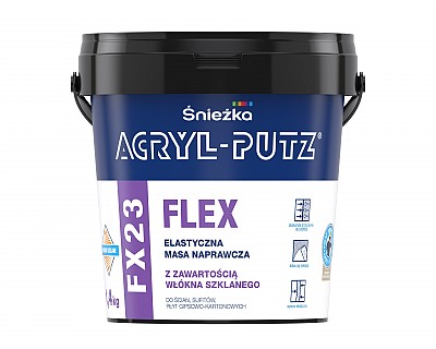 ACRYL PUTZ FX23 FLEX - gotowa do użycia elastyczna masa naprawcza z dodatkiem włókna szklanego znajdująca zastosowanie przy wszelkich pracach naprawczych wewnątrz i na zewnątrz pomieszczeń. Ze względu na wysoką i stałą elastyczność można ją stosować na pęknięcia o szerokości do 5 mm bez konieczności stosowania taśm zbrojeniowych. Masa po wyschnięciu pozostawia transparentną powłokę z widocznymi włóknami, którą można pokryć gładziami/masami szpachlowymi ACRYL PUTZ w zależności od rodzaju i przeznaczenia podłoża.