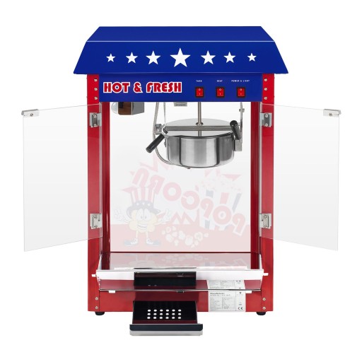 Podwójne drzwi z magnetycznym zamknięciem oraz uchylna szuflada ułatwiają obsługę urządzenia oraz nabieranie popocornu. W dnie komory znajduje się perforowana szuflada, której zadaniem jest odprowadzenie resztek oleju oraz nieuprażonych ziaren.