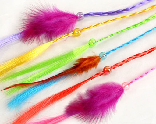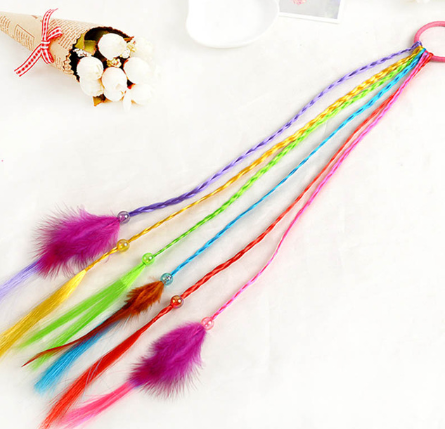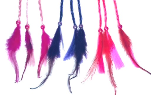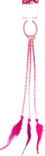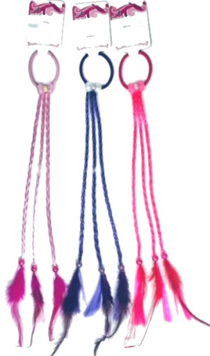 Pasemka, gotowe warkoczyki, ozdobione na końcu kolorowymi piórkami i koralikiem. Gumka do włosów ozdobiona plastikową kokardką z małym kryształkiem.