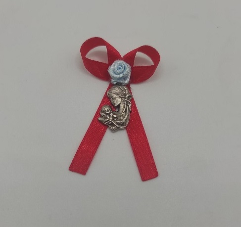 Wstążeczka czerwona z medalikiem do wózka dziecięcego. Wykonana z tasiemki, przyozdobiona kwiatkiem co dodaje jej uroku. Pięknie ozdobi każdy wózek dziecięcy czy nosidełko. Zapinana na szpilkę , co stanowi łatwe zapięcie.