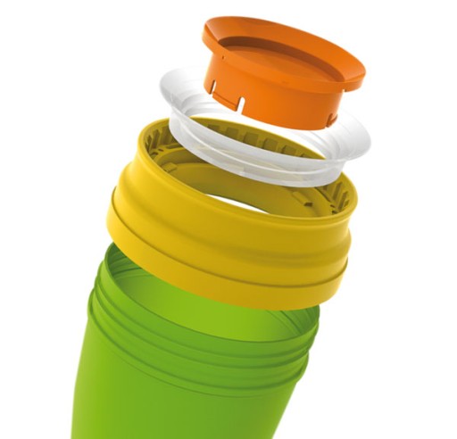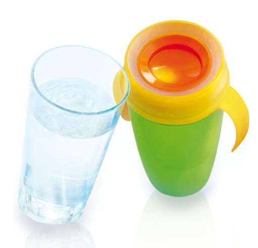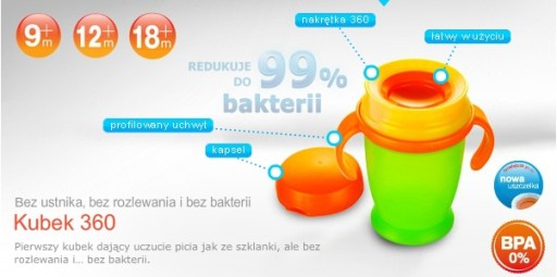 Łatwy do umycia, umożliwia picie bez rozlewania, ale celowo nie jest niekapkiem (przy silnym potrząśnięciu lub upadku wydobywają się krople płynu) - uczy dziecko kontroli ruchów i przygotowuje do picia z otwartego kubka. Uszczelka do kubka jest również sprzedawana osobno.