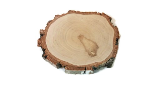Drewniane plastry brzozy z grubą ciemną korą suszone oraz szlifowane.