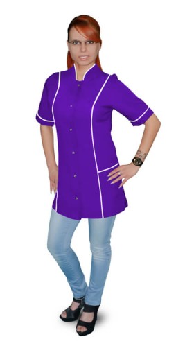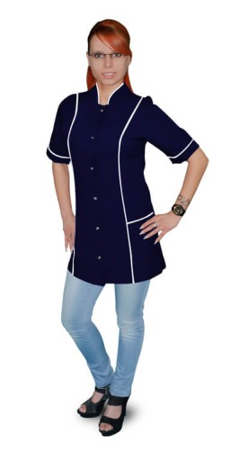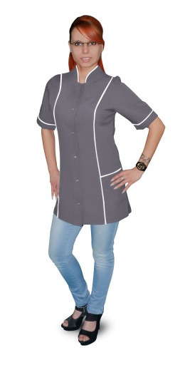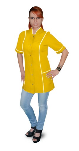 Rękaw fartuszka dosięga do łokci, natomiast całość do połowy uda. Nadaje się zarówno do pracy w sklepie jak i służbie zdrowia, choćby w aptece czy przychodni.
