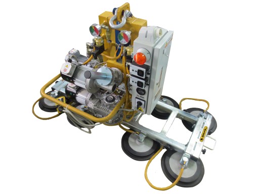 Urządzenie firmy Superlifter do próżniowego podnoszenia z ciągłym ręcznym obrotem 0-360° i ręcznym pochyłem 0-90° przeznaczone do podnoszenia tafli szkła o maksymalnym ciężarze 800 kg