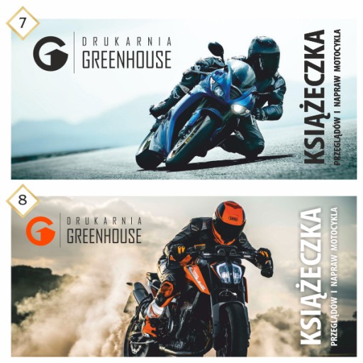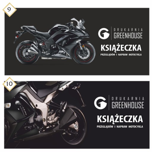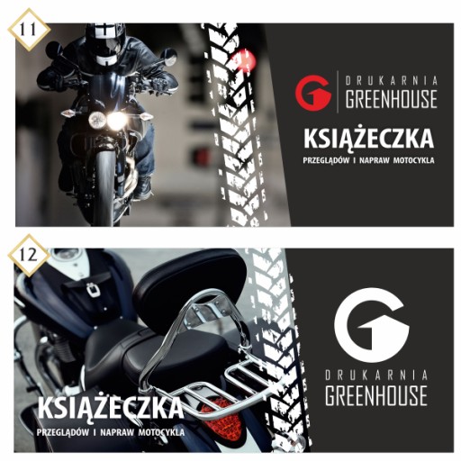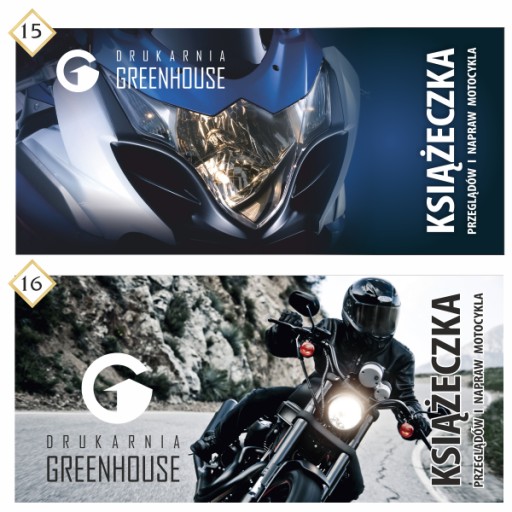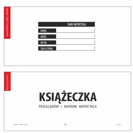24 stronnicowa (z okładką 28 str.) książeczka przeglądów i napraw motocykla o wymiarze 21 x 9,5 cm (po rozłożeniu 42 x 9,5 cm). Książeczka serwisowa to świetny sposób na udokumentowanie serwisów, przeglądów, napraw, wymiany opon i części itd. Okładka książeczki drukowana jest w pełnym kolorze z miejscem na wpisanie danych warsztatu lub właściciela, środek w jednym kolorze (czarnym). Na Państwa życzenie możliwe jest nadrukowanie danych/loga na okładce oraz tyle książeczki lub pozostawienie pustego miejsca na ręczny wpis lub pieczątkę. Dzięki technologii druku cyfrowego książeczki są doskonałej jakości, a druk na nie ma prawa się rozmazywać nawet pod wpływem deszczu.