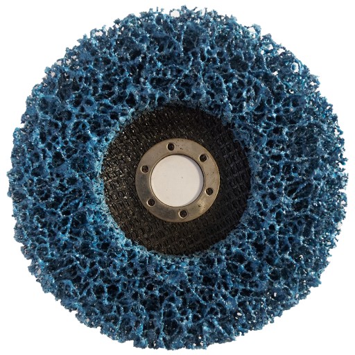 Dysk z włókninowy Scotch-Brite Clean&Strip CG-RD w kolorze niebieskim na sztywnej podkładce przeznaczony do użytku ze szlifierką kątową.