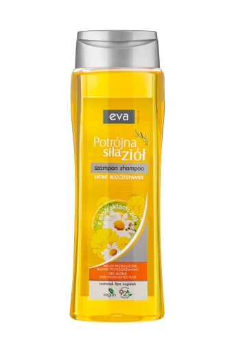 Szampon Potrójna Siła Ziół to rumiankowy szampon oparty o naturalne ekstrakty z ziół. Polecany do jasnych włosów, gdyż wzmacnia ich refleksy. Zawiera hydro kompleks z prowitaminy B5 oraz PP, który wpływają na odpowiednie nawilżenie i miękkość włosów.