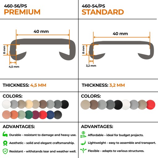 - Łatwy montaż – profil z miękkiego PVC – tworzywa termoplastycznego - jego cechy uzależnione są od temperatury (zanurzenie w gorącej wodzie ułatwia proces układania).