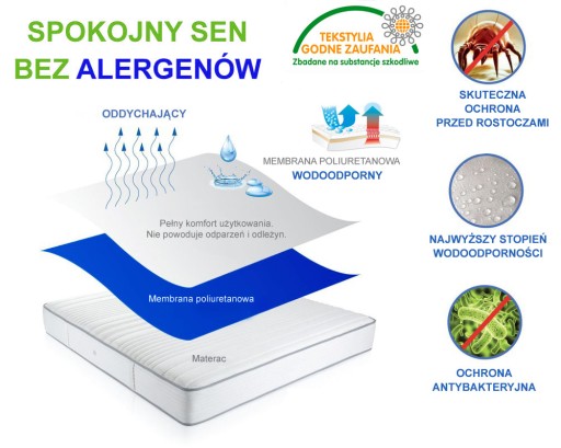 - Ochraniacz na materac frotte z membraną poliuretanową, która zabezpiecza przed przesiąkaniem płynów.