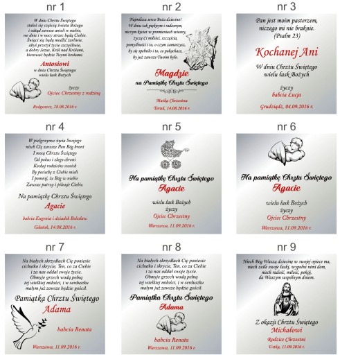 - podaj treść zaznaczoną kolorem czerwonym (tj. imię dziecka, podpis (kto wręcza), datę chrztu, miejscowość - opcjonalnie),