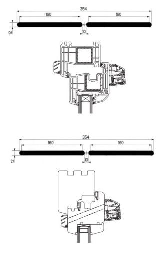 Na pierwszym rysunku pokazany jest montaż nawiewnika w oknie PCV. Pokazany jest również przekrój otworów przelotowych, wraz z jego średnicą, długością oraz odstępem między otworami.