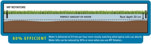 MP Rotator zapewnia zwiększony zasięg w porównaniu do tradycyjnych zraszaczy, z odpowiednio dostosowanym opadem przy dowolnie ustawionym kącie i zasięgu. Wolniejsze tempo nawadniania wymaga dwukrotnie większego czasu pracy w stosunku do tradycyjnych zraszaczy, znacznie ograniczając zjawisko spływania wody – jest to idealne rozwiązanie w przypadku zboczy i zwięzłych gleb. Zwiększona wydajność oznacza o 30% mniejsze zużycie wody w porównaniu do tradycyjnych zraszaczy.