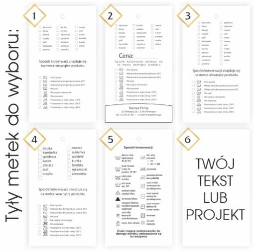 Metki odzieżowe o standardowych wymiarach 50 x 90 mm do zawieszenia na odzieży/wieszaku. Druk dwustronny, awers (przód metki) w pełnej barwie, rewers(tył metki) druk czarno biały. Dzięki technologii druku cyfrowego metki są doskonałej jakości, a druk nie ma prawa się rozmazywać nawet pod wpływem deszczu. W każdym wzorze jest możliwość dodania indywidualnego loga. Jeśli posiadają Państwo własny projekt chętnie go dla Państwa wydrukujemy nie wpływa to na dodatkowe koszty. Możemy przygotować indywidualny projekt który jest GRATISOWY. W razie jakichkolwiek pytań, proszę pisać.