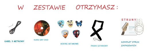 Zestaw zawiera pasek do gitary, aby wygodnie podtrzymywał instrument podczas gry, kabel do podłączenia ze wzmacniaczem, kurs z nauką gry na gitarę elektryczną - Laboratorium Gitary oraz kostki do gry.
