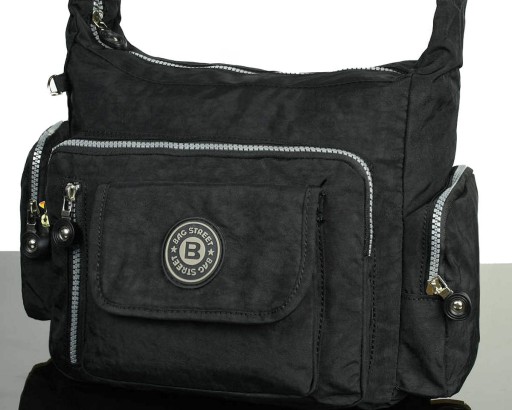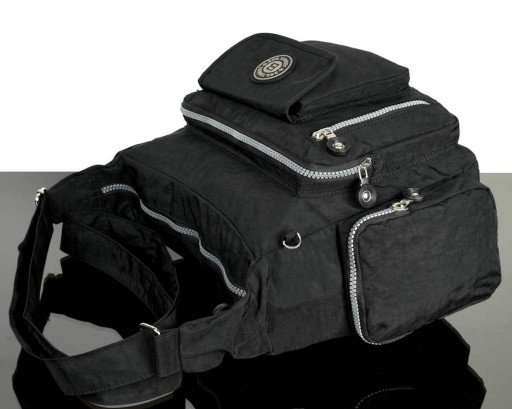 wewnątrz przegroda zamykana suwakiem. Na zewnątrz mamy do dyspozycji 7 podręcznych kieszonek na mniejsze przedmioty. Długi pasek pozwala