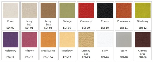 - Kolor stelaża (PŁYTY) i kolor siedziska (ECO-SKÓRA) prosimy wybrać na podstawie zamieszczonej PONIŻEJ palety kolorów.