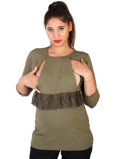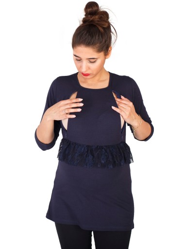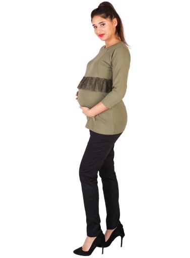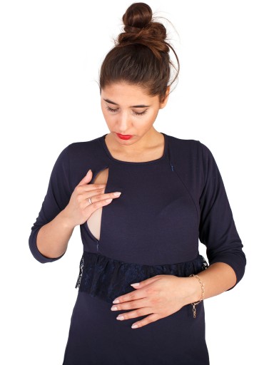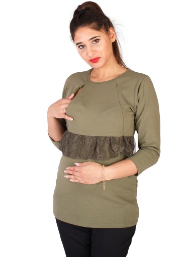 ERIN Bluzka ciążowa z rękawem 3/4 to połączenie wygody i elegancji. Miła w dotyku bawełna zapewnia komfort i swobodę ruchów, a elegancki fason z odciętą talią przy pomocy paska koronki, sprawia, że bluzkę z powodzeniem założymy do biura czy na spotkanie służbowe. Model ten jest przystosowany również do okresu po ciąży. Dzięki wszytym na biuście zamkom błyskawicznym umożliwia wygodne nakarmienie dziecka.
