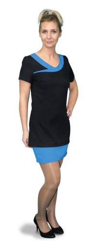 Standardowo fartuch czarny z kolorowym kołnierzykiem i dopasowanym do jego kolorystycznie spódnica.
