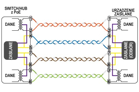 Zasilacz pracuję według opcji B standardu, tj. zasilanie przesłane jest przez wolne pary 4/5 oraz 7/8.