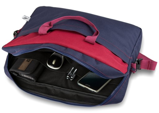 Z przodu znajduje się pojemna kieszeń zapinana na zamek błyskawiczny, która zmieści zasilacz, myszkę oraz inne akcesoria.