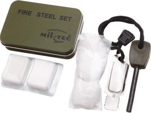 Zapakowany w metalowe pudełko surwiwalowy zestaw do rozpalania