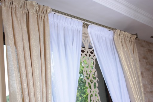 Zasłona górą wykończona taśmą marszczącą typu smok o szerokości 5 cm , wszytą z naddatkiem kryjącym żabki.