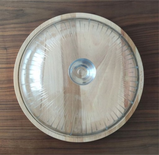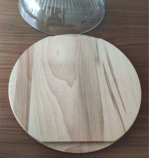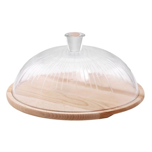 Drewniana deska ze szklanym kloszem idealna do serwowania i przechowywania serów, wędlin i ciast.