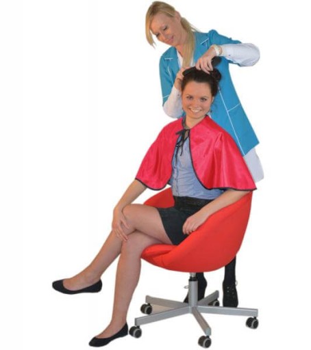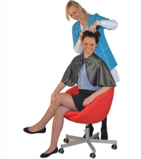 Mała, ale bardzo wygodna w użyciu, szeroka peleryna fryzjerska. Wykonana ze specjalnie w tym celu stworzonego poliestru, dzięki czemu jest niezwykle śliska i zapobiega wbijaniu się włosów w odzież. Wiązana pod szyją w tradycyjny sposób– troczkami.