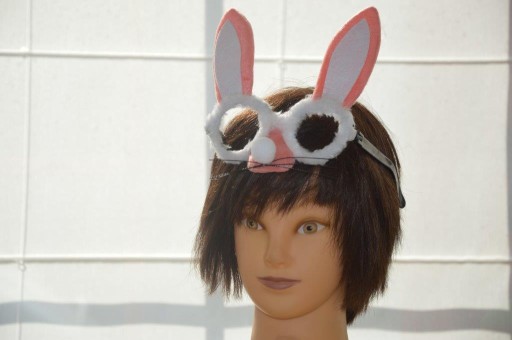 Okulary królika o wymiarach 21x16 cm. Okulary obszyte materiałem, do okularów przyczepione uszka królika. W kolorach:łososiowy(fotka),różowy,zielony.