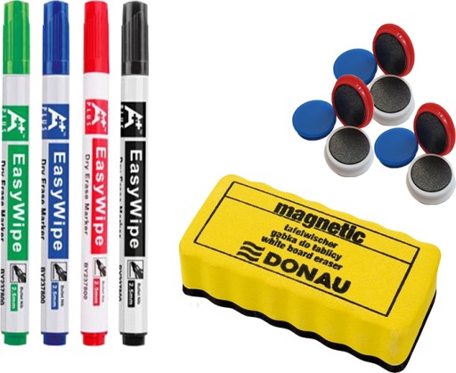 4 szt. markerów Memoboards, 9 szt. polskich, bardzo mocnych, powlekanych magnesów, gąbka magnetyczna Donau lub Memoboards