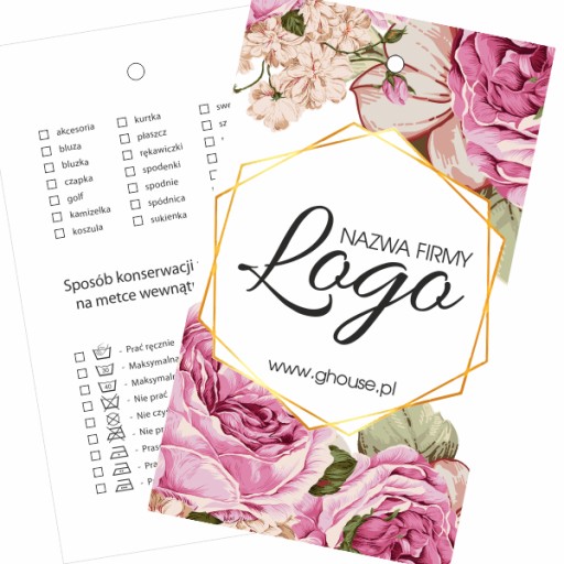 Metki odzieżowe o standardowych wymiarach 50 x 90 mm do zawieszenia na odzieży/wieszaku. Druk dwustronny, awers (przód metki) w pełnej barwie, rewers(tył metki) druk czarno biały. Dzięki technologii druku cyfrowego metki są doskonałej jakości, a druk nie ma prawa się rozmazywać nawet pod wpływem deszczu. W każdym wzorze jest możliwość dodania indywidualnego loga. Jeśli posiadają Państwo własny projekt chętnie go dla Państwa wydrukujemy nie wpływa to na dodatkowe koszty. Możemy przygotować indywidualny projekt który jest GRATISOWY. W razie jakichkolwiek pytań, proszę pisać.