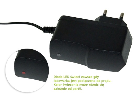 - Sygnalizacja LED: Tak - Dioda sygnalizuje tylko działanie ładowarki, nie wskazuje stopnia naładowania akumulatora