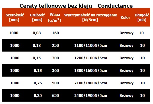 Specyfikacja cerat/tkanin teflonowych bez kleju