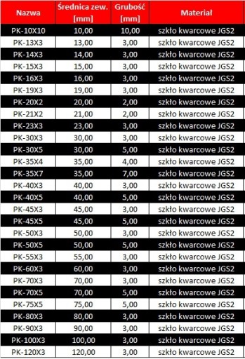Tabela wymiarowa okrągłych płytek kwarcowych dostępnych naszych aukcjach: