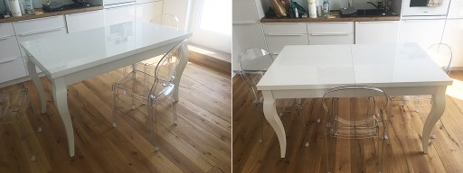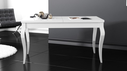 Prosty, nowoczesny a zarazem elegancki stół LUMINA w wysokim połysku. Dzięki odświeżonym nogom w stylu Ludwikowskim pasuje do pomieszczeń tradycyjnych jak i super-nowoczesnych.