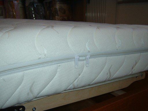 Pokrowiec obszyty jest grubym zamkiem ( 5 mm ) z trzech stron z dwoma suwakami , co ułatwia jego zakładanie na materac.