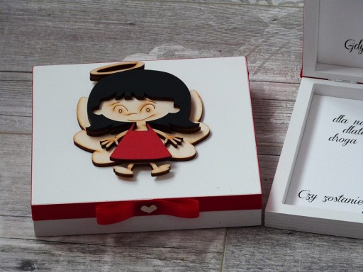 Sprzedajemy wykonywaną na zamówienie prośbę o zostanie Matką Chrzestną/ Ojcem Chrzestnym. Jest to drewniane pudełko pomalowane na biało. Ozdobione Aniołkiem (dziewczynką lub chłopcem w zależności od płci dziecka), wstążką oraz serduszkami w środku.