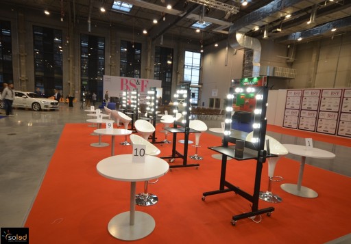 Mobilne, dwustronne stanowisko z dwoma lustrami z żarówkami LED zostało zaprojektowane głównie na potrzeby firm kosmetycznych i fryzjerskich wystawiających się na targach oraz różnych eventach i wydarzeniach branżowych.